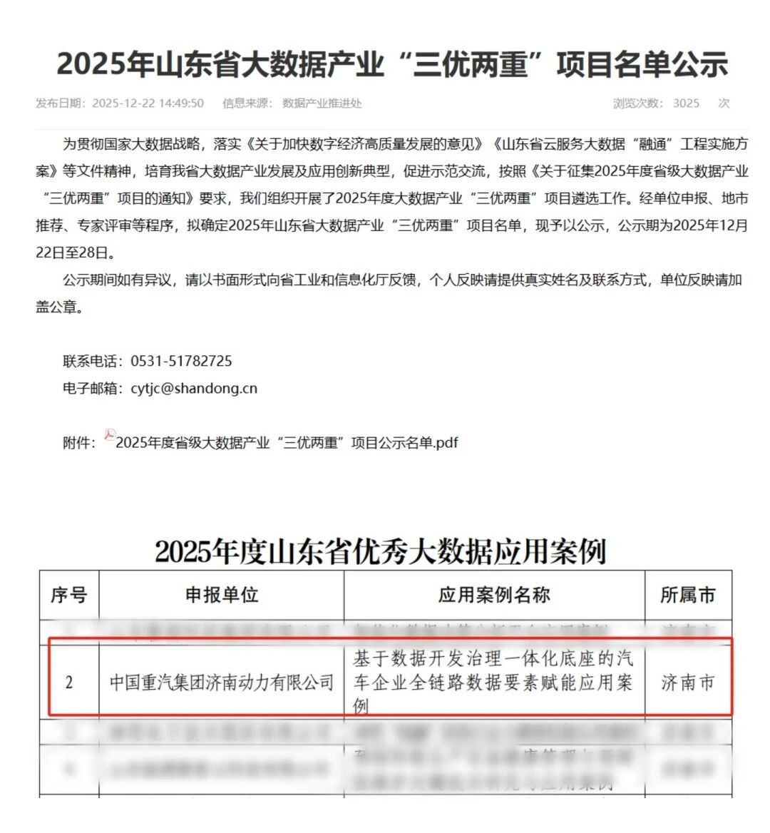 近日,山东省工业和信息化厅发布了2025年山东省大数据产业“三优两重”项目名单,山东重工旗下中国重汽济南动力有限公司申报的“基于数据开发治理一体化底座的汽车企业全链路数据要素赋能应用案例”,成功入选2025年度山东省优秀大数据应用案例。